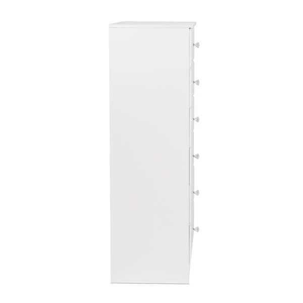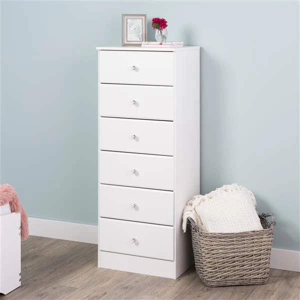 This Astrid 6-Drawer Tall Chest with Crystal Knobs is your small space solution. It’s contemporary design and clean lines will complement any decor. Profiled drawer fronts and acrylic crystal knobs add a beautifying touch. Use on its own or pair it with other matching pieces from the Astrid Collection.