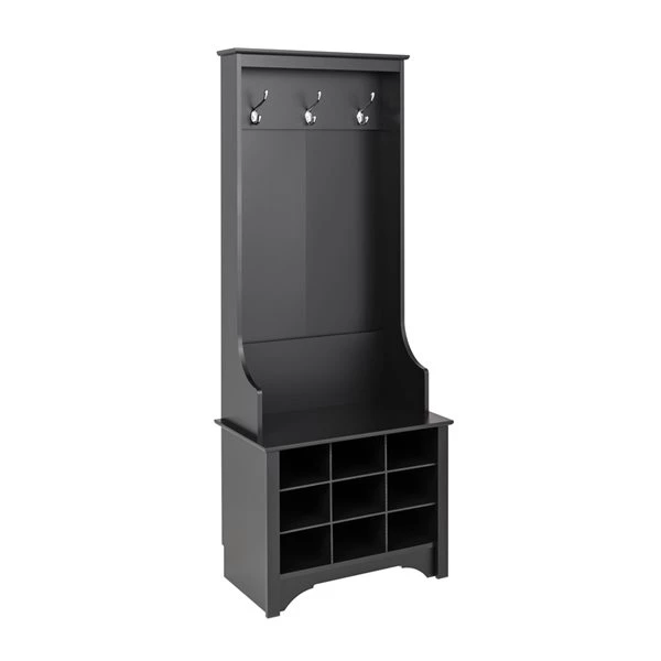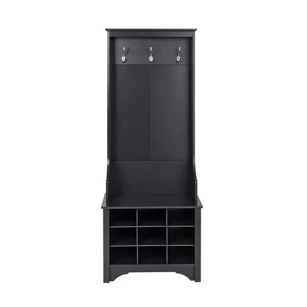 Get organized with the Prepac narrow hall tree. The stylish and minimalist design allows the hall tree to fit in compact spaces, while still providing plenty of space for all your entryway belongings. Place your jackets, hats, purses and scarves on the 3 strong double coat hooks, and store your shoes in the 9 convenient shoe cubbies, which double as a bench. The space-saving design will add essential storage to your home.