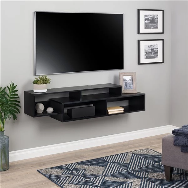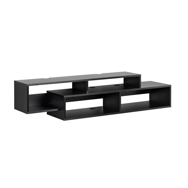 Keep your living space serene with this modern wall-mounted media console and storage shelf that is both modern yet reminiscent of the mid-twentieth century. Mount your TV on the wall above the four staggered compartments which are ideal for today’s assortment of compact electronic devices as well as decorative items like plants or photographs. Each shelf has cutouts so you can keep your cables and wires organized from top to bottom. The console is easy to mount under your TV using an innovative metal rail system. You just need to locate 4 wooden wall studs for mounting. Manufactured in Canada from non-toxic, laminated composite woods and meets all North American safety standards. Ships ready to assemble, includes an instruction booklet for easy assembly and has a 5-year manufacturer’s limited warranty.