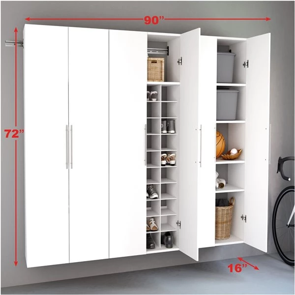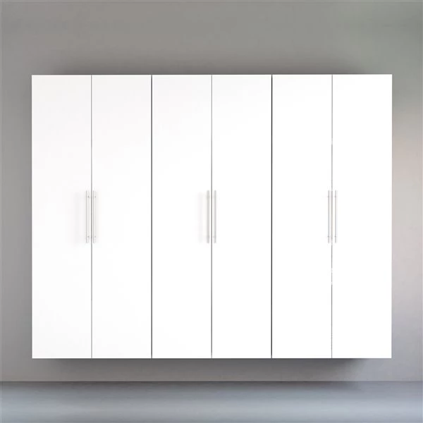The HangUps Storage Cabinet Collection by Prepac(R) offers versatility for your ever changing storage needs in the garage, laundry room, office or workshop. The Cabinets mount securely to the wall with a heavy duty metal rail and hook system. The wall mounted feature ensures easy cleaning beneath the cabinets and protects your stored items from water & dirt. The HangUps Collection by Prepac(R) is constructed using laminated composite wood and features metal handles and adjustable hinges. This product ships ready-to-assemble and includes all hanging rails and fastening bolts. Add other cabinets from our HangUps Collection by Prepac(R) to create a storage system to convert any cluttered room into an organized space. Set Includes: 1 x 30″w x 72″h x 16″d Shoe Storage Cabinet, 2 x 30″w x 72″h x 16″d Storage Cabinet