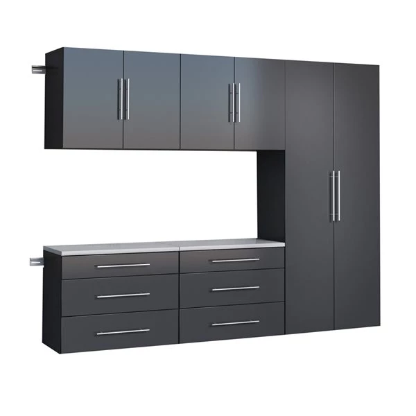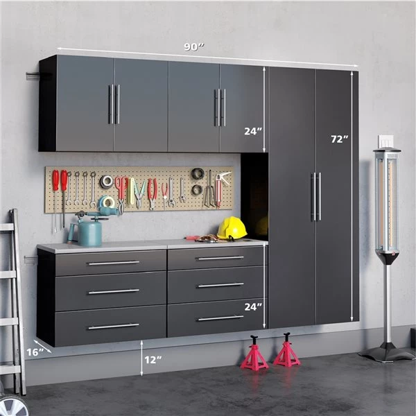 The HangUps storage cabinet collection offers versatility for your ever-changing storage needs in the garage, laundry room, office or workshop. The cabinets mount securely to the wall with a heavy-duty metal rail and hook system. The wall mounted feature ensures easy cleaning beneath the cabinets and protects your stored items from water and dirt. The HangUps collection is constructed using laminated composite wood and features metal handles and adjustable hinges.