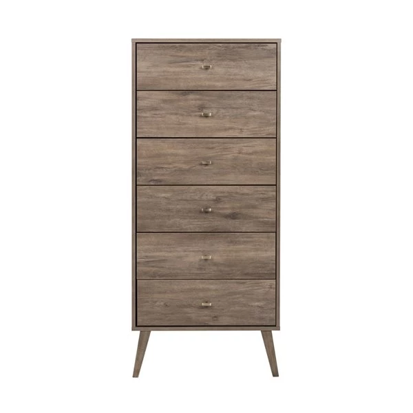 Add a vintage touch to your bedroom with this chest by Prepac(R). Its narrow, space saving design provides maximum storage in the smallest footprint, making it a great fit for condos and smaller spaces. Six drawers run smoothly on metal glides, offering easy access to storage for clothing and bedroom items. The tapered solid wood legs and inset drawers deliver a clean and modern look to your bedroom. Brushed brass finished knobs add to the retro-chic design for a functional and fashionable dresser. Style this dresser on its own, or combine it with any of the products in the Milo collection for a timeless look.