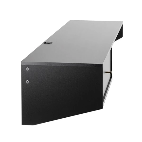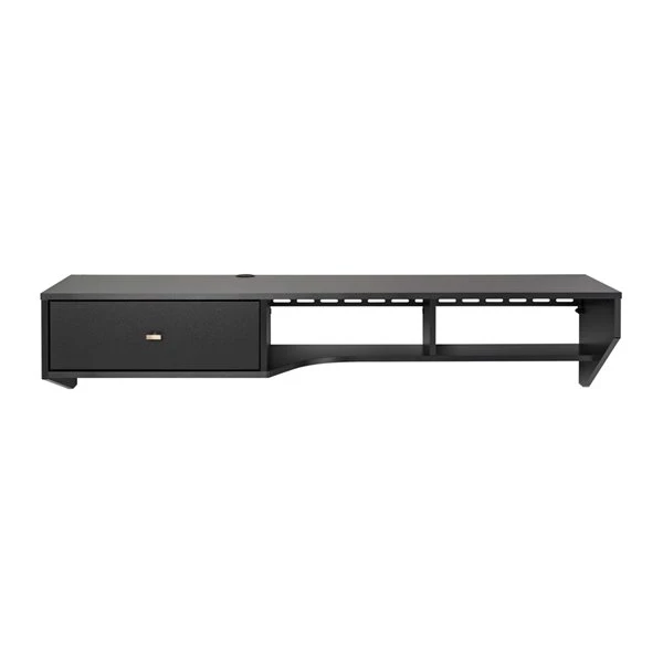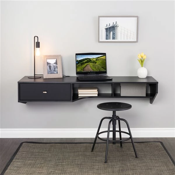 Are you tired of using your lap and couch when you work from home or study at home? The modern floating desk with drawer by Prepac offers a sleek and elegant alternative. At only 12.5 inches high, it doesn’t take up a lot of vertical wall space, however, it is a substantial 58 inches wide which makes for ample room as a computer or writing desk. This modern black design has everything you need for a work station: a drawer with metal glides for stowing away your pens and notepads, two lower compartments for holding books or miscellaneous items, and a work surface large enough for your laptop complete with a round grommet for wire management. Stylistic touches include the brushed brass knobs on the drawer and the curve of the lower shelf to provide more legroom. Wall mounted installation is a breeze with Prepac’s innovative metal hanging rail system. Manufactured in Canada from nontoxic, laminated composite woods and meets all North American safety standards.