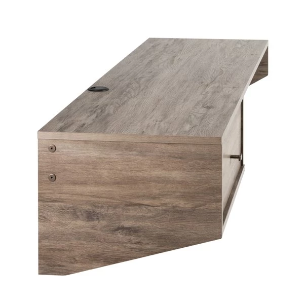 Are you tired of using your lap and couch when you work from home or study at home? The modern floating desk with drawer by Prepac offers a sleek and elegant alternative. At only 12.5 inches high, it doesn’t take up a lot of vertical wall space, however, it is a substantial 58 inches wide which makes for ample room as a computer or writing desk. This modern grey design has everything you need for a work station: a drawer with metal glides for stowing away your pens and notepads, two lower compartments for holding books or miscellaneous items, and a work surface large enough for your laptop complete with a round grommet for wire management. Stylistic touches include the brushed brass knobs on the drawer and the curve of the lower shelf to provide more legroom. Wall mounted installation is a breeze with Prepac’s innovative metal hanging rail system. Manufactured in Canada from nontoxic, laminated composite woods and meets all North American safety standards.