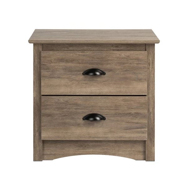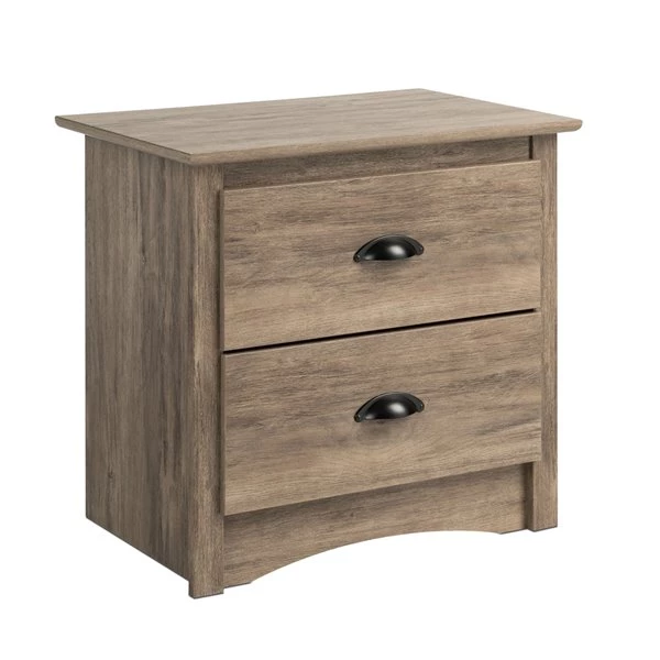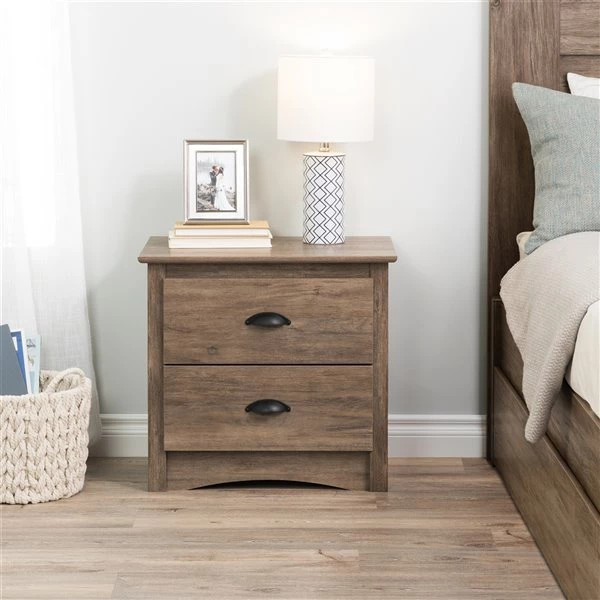 Can your bedroom furniture be both elegant and functional? This space-saving bedside table makes it possible with two full-sized drawers, each perfect for keeping the knick-knacks of your life out of sight. Use the sturdy top to pile on your books, cell phone, alarm clock, lamp and whatever else you like: this night table will look posh no matter what it’s storing. The drifted gray laminate finish adds a hint of warm coastal style and the black metal hooded handles add a vintage touch. Ships Ready to Assemble, includes an instruction booklet for easy assembly. Manufactured in Canada and meets all North American safety standards. 5-year manufacturer’s limited parts warranty.