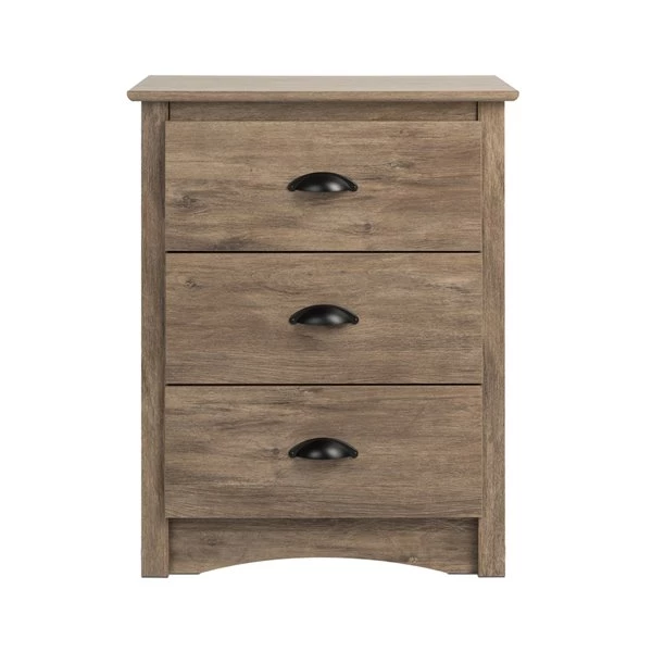 The 3-Drawer Nightstand is both modern and functional. This space-saving bedside table gives you three full-size drawers, all perfect for storing the odds and ends of your life out of sight. Use the sturdy profiled top to pile on your books, cell phone, alarm clock, lamp and whatever else you like: this nightstand can take it with style to spare. The drifted gray laminate finish adds a hint of warm coastal style and the black metal hooded handles add a vintage touch. Ships Ready to Assemble, includes an instruction booklet for easy assembly. Manufactured in Canada and meets all North American safety standards. 5-year manufacturer’s limited parts warranty.
