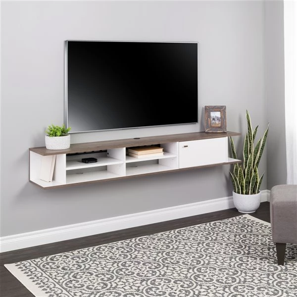 Complement your wall-mounted TV with this modern and functional wall-mounted media console with door. Two compartments with adjustable and removable shelves provide the flexibility to display and store a range of electronic devices like game consoles, routers, DVDs, set-top boxes, mini speakers and disc players. Wire management holes adjacent to the wall neatly concealed cables and wires. The large enclosed compartment is ideal for storing games, DVDs and accessories and its door is finished with a brushed brass knob. On either end of the console are two small nooks which are perfectly suited for the occasional book, disc or decorative item. Easily mount the console under your TV using an innovative metal rail system. You just need to locate 4 wooden wall studs for mounting. Manufactured in Canada from non-toxic, laminated composite woods and meets all North American safety standards.