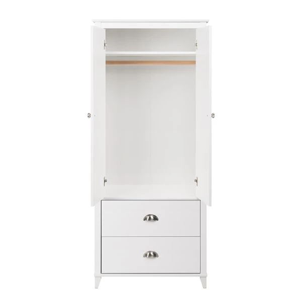 Standing at 72 inches tall, the stylish Prepac Yaletown 2 Door Armoire will fit all your storage needs. The wooden rod behind the double doors is perfect to hang your blazers, coats and shirts, while the shelf above can be used to store linens or accessories. Two large drawers complete this armoire and provide even more storage space to help keep you organized. Decorative moulding and brushed nickel hooded pulls and knobs give the armoire a classic look, while the 4 wooden legs lift the armoire off the ground to create a timeless décor. Combine this armoire with other items in the Prepac Yaletown Bedroom Collection for a complete look.